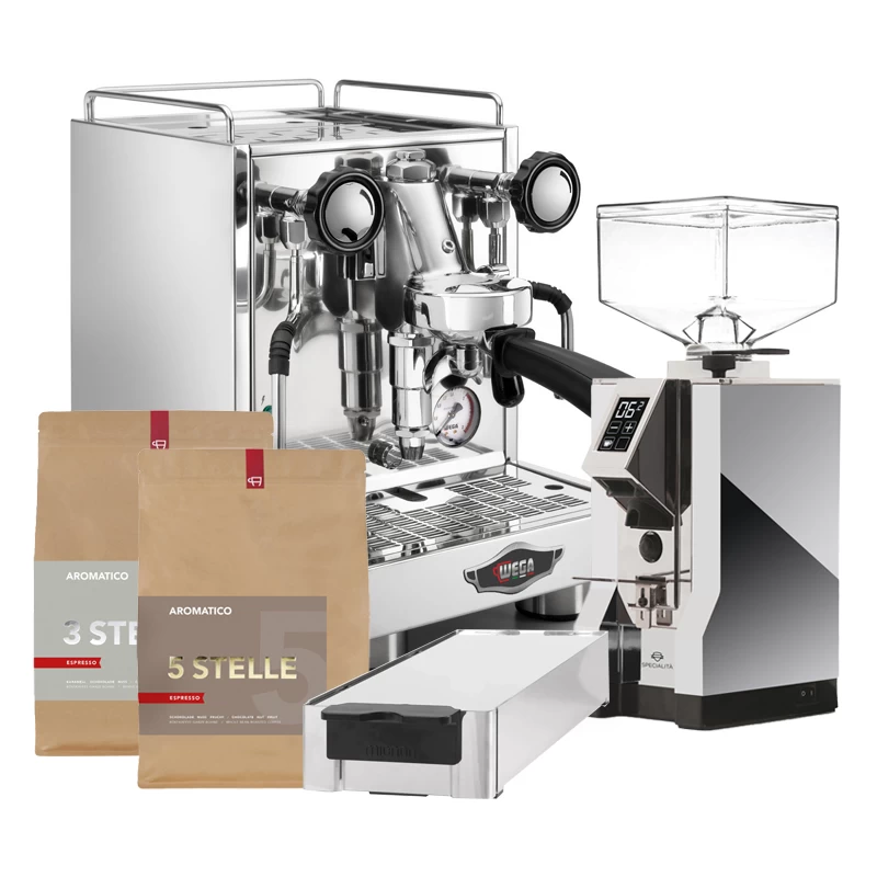 Hier treffen erstklassige Marken aufeinander! In diesem exquisiten Bundle enthalten ist die WEGA Mini Edelstahl, die Mignon Specialita 55 16 Chrom von Eureka, die Mignon Abschlagbox ebenfalls von Eureka sowie zwei hochwertige Espressi. Für jeden Barista ein traumhaftes Quartett – so gelingt der perfekte Kaffeemoment garantiert!