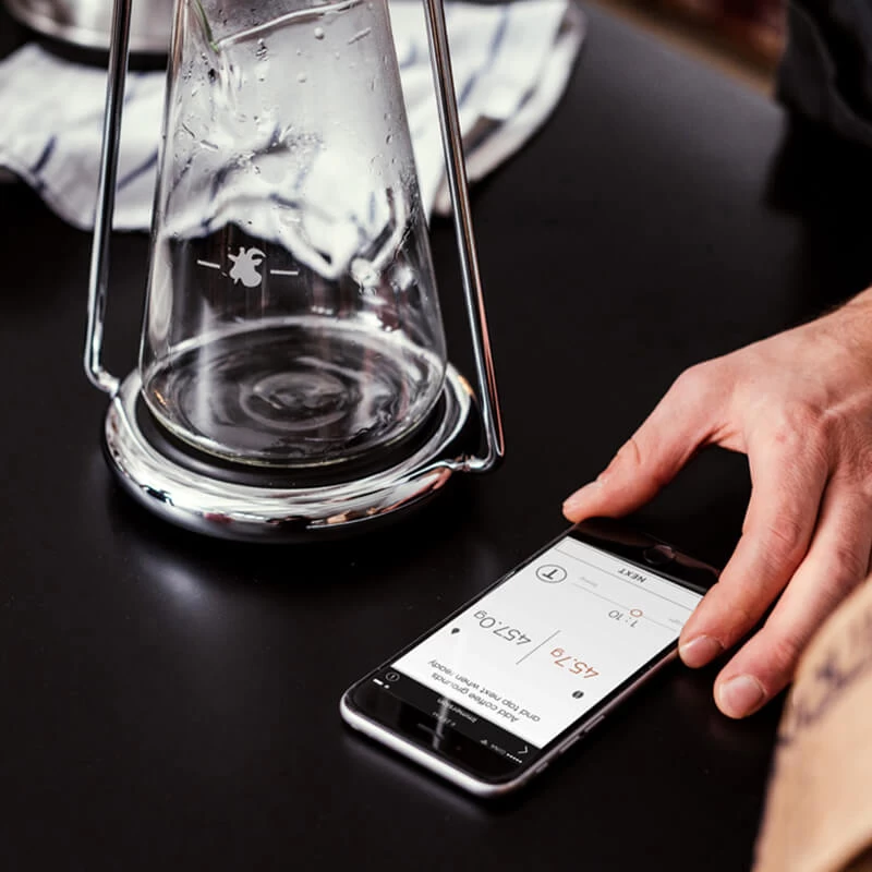 Um die vielfältigen Features des GINA coffee makers optimal nutzen zu können wurde in den Boden eine Waage integriert. Diese lässt sich via Bluetooth mit dem Smartphone und der GINA App verbinden. So ermöglicht die App die Überwachung der wichtigsten Parameter für eine optimale Extraktion auf einen Blick. Außerdem bietet die App nutzerfreundliche Schritt-für-Schritt-Brühanleitungen.