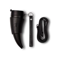 Der Goat Mug des slowenischen Unternehmens Goat Story ist eine Hommage an das namensgebende Tier – die Ziege. Der Kaffeebecher trägt die an Wikinger erinnernde Form eines Horns. Trotz seiner Form ist der auffällige Mug sehr praktisch. Die smart designte Manschette aus Echtleder dient nicht nur als isolierender Griff, sondern kann einfach abgenommen, umgedreht und als Ständer genutzt werden, um das Horn senkrecht hinzustellen. Mit den ebenfalls ledernen Gurten (einer lang, einer kurz) kann der Becher flexibel an Taschen und Rucksäcken fixiert oder lässig am Körper getragen werden. Für flexiblen Kaffeegenuss in allen Lagen lässt sich der Verschluss einfach mit einer Hand öffnen. Damit das Trinkhorn auch überkopf oder in der Tasche verstaut keine Flecken hinterlässt, sind Verschluss und Deckel extra auslaufsicher gestaltet. Das Horn aus BPA-freiem Kunststoff kann, ohne die Lederteile, in der Spülmaschine gereinigt werden.