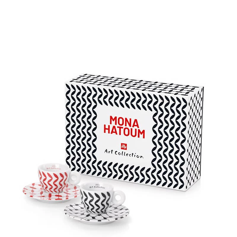 Das Limited Edition Espressotassen Set besteht aus zwei hochwertigen Espressotassen mit einem besonderen Design der Künstlerin Mona Hatoum. Die Tassen stammen aus der illy Art Collection und erinnert an das klassische Motiv der Kefiah. Dekoriert wurde die traditionelle arabische Kopfbedeckung mit Olivenblättern und Fischernetzen.