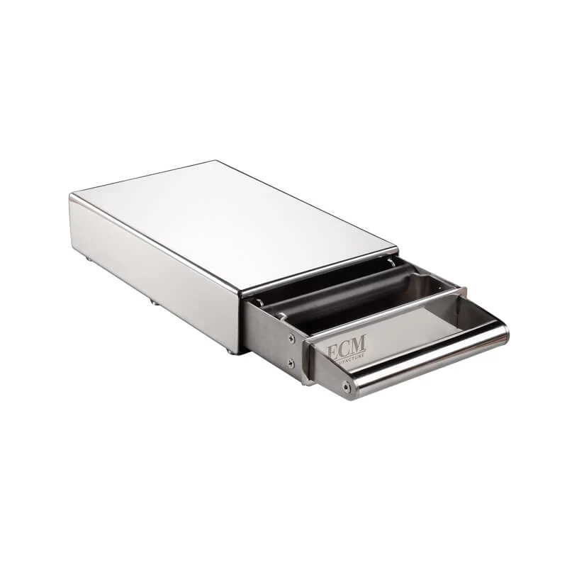 Die Sudschublade von ECM lässt sich komfortabel aus- bzw- einziehen, während der gummierte Abklopfstab ein geräuscharmes, sowie materialschonendes Abklopfen des Siebträgers ermöglicht. Typisch für ECM ist die hochwertige Verarbeitung des polierten Edelstahls. Optisch weiß die Sudschublade durch puristische Klasse zu überzeugen und lässt sich dadurch gut in Ihre vorhandene Serie von ECM einbinden. Auf der Sudschublade können Sie ideal Ihre Mühle platzieren und schaffen somit Platz für weitere Küchenutensilien.
