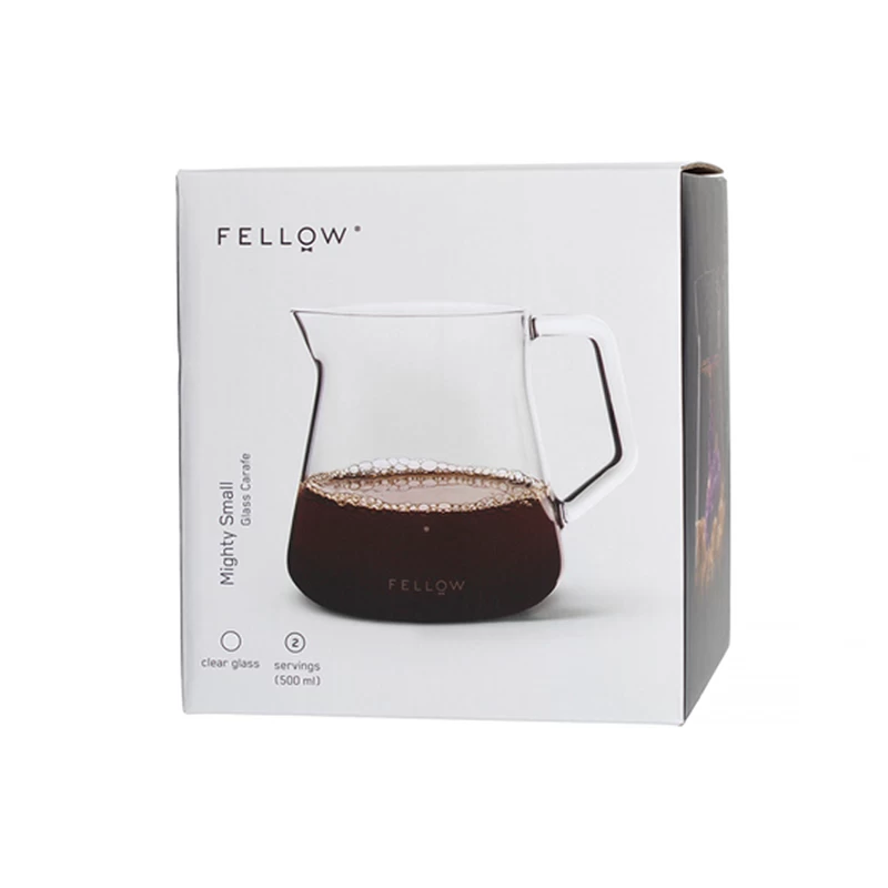 Das Material der „Mighty Small“ Glaskaraffe von Fellow besteht aus mundgeblasenem, 2 mm starkem Borosilikatglas. Das Glas hält den Inhalt gut warm und ist zudem besonders widerstandfähig. Auf der Karaffe ist ein kleiner Punkt zu sehen, welcher die Füllhöhe für 300 ml Kaffee markiert. Das maximale Füllvolumen wird von Fellow mit 500 ml angegeben. Das Leergewicht der Karaffe beträgt 250 g.